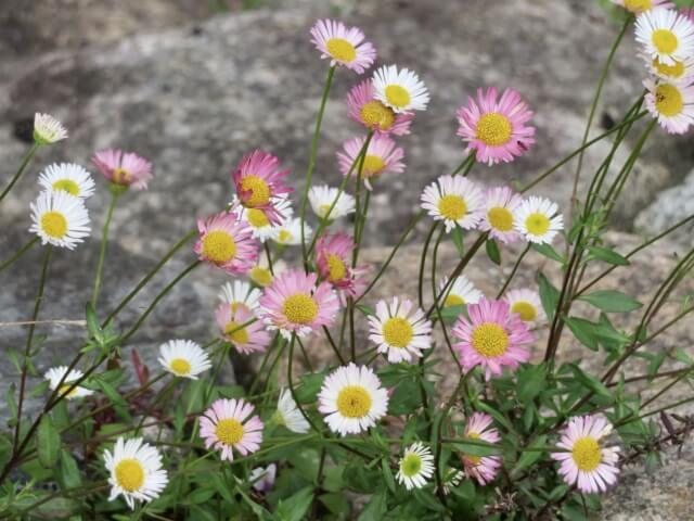 エリゲロン(源平小菊:ゲンペイコギク)は、咲き進むにつれて花色が白からピンクへと変化し、一株で2色の花が咲いているように見える、非常にナチュラルで可愛らしい多年草です。